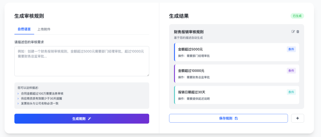 • 自然语言生成:顺利获得日常语言描述审核需求,自动解析为含触发条件、逻辑、风险等级的标准规则;